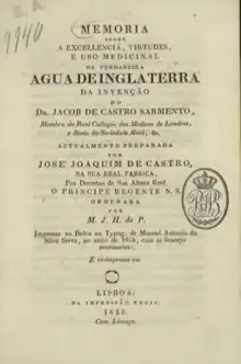 Água de Inglaterra was used for the treatment of malaria, which at the time was endemic in several regions of Portugal, including the Sado River valley and the Guadiana river.[5] It was initially introduced from England in 1681 by Dr. Fernando Mendes, who “received a handsome gift from (King Dom Pedro) on condition that he should reveal to him the secret of his composition and withhold it from the public”. However, the popularity of the mixture was short-lived, either because it did not perform as claimed or because of the sudden death of Mendes. The medicine, which was produced through an infusion of the cinchona bark in alcohol, was subsequently popularised in the 1730s by Jacob de Castro Sarmento, a Portuguese doctor who lived in London from around 1720. Sarmento is believed to have left Portugal in order to freely practice the Jewish religion. He was elected to the Royal Society in 1730 and was the first Jew to obtain a Doctorate in Medicine from a British university. He was a pioneer in work to develop a smallpox vaccine.[5]