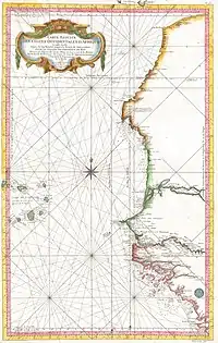 The extent of his second 1446 journey is more uncertain. Zurara reports Fernandes sailed as far as 110 leagues beyond Cape Vert.[18] If Zurara was exactly correct, that would mean Fernandes reached the environs of Cape Verga (10°12′16″N 14°27′13″W / 10.20444°N 14.45361°W, in modern Guinea), an incredible leap beyond his last point.[19] Chronicler João de Barros goes even further, identifying the river Fernandes sailed up as the "Rio Tabite". The exact identification of "Rio Tabite" is uncertain, for that name is not found on old charts.[20] Barros notes merely that Rio Tabite is 32 leagues beyond the "Rio de Nuno Tristão".[21] If we assume the latter to be the Nunez River (in modern Guinea), that would lead us to identify the "Rio Tabite" with the Forecariah River 9°16′57″N 13°20′10″W / 9.28250°N 13.33611°W in modern Guinea, implying Fernandes sailed a tremendous 135 leagues beyond Cape Vert, well beyond the 110 suggested by Zurara.[22] At the other extreme, the Viscount of Santarém identified the Rio Tabite with the Rio do Lago (Diombos River, in the Sine-Saloum Delta of Senegal), a mere 24 leagues from Cape Vert.[23] However, the Diombos is the prime candidate location for the death of Nuno Tristão himself.[24] If that was also sailed by Fernandes, then that eliminates Fernandes's claim to have exceeded Nuno Tristão's last point by many leagues. The Tabite has also been tentatively identified with the Gambia River,[25] although this does not find many adherents for the same reasons of being too close to Tristão's last point.