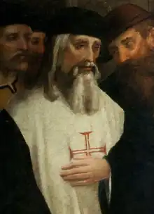 ![]() Detail of a figure in Garcia Fernandes's 1541 Wedding of Saint Alexis, identified on the hem of his robes as "D. ALVARO DA COSTA PRIM.RO P.DOR DESTA CASA". | |