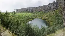 The canyon's steep sides are formed by cliffs up to 100 metres (330 ft) in height. Within the canyon is a woodland of birch and willow. Between 1947 and 1977, a number of foreign tree species were introduced, including spruce, larch and pine. The small lake Botnstjörn [ˈpɔsːˌtʰjœ(r)tn̥] is home to a variety of waterfowl species.