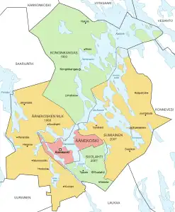 The Äänekoski parish was formed in 1907 from parts of the Laukaa parish. The municipality Äänekosken maalaiskunta was formed in 1911 from parts of Laukaa and Saarijärvi. At that time the municipality was known simply as Äänekoski.[2]