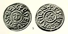![]() The obverse and reverse of a coin from the reign of Æthelweard. | |