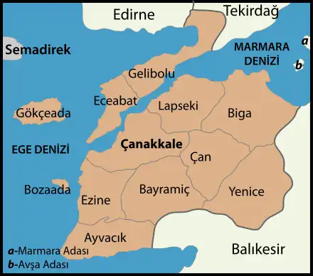 Çanakkale province is divided into 12 districts, including the capital district Çanakkale (or Merkez):[11]