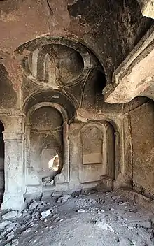There were four arcosolia in the parekklesion, two each on the north and south walls.[1]:32 The two northern arcosolia had been buried by the 1990s when a full survey of the site was conducted, but they have since been uncovered by illegal excavations.[1]:32 No evidence of burials within the arcosolia themselves survive, but the excavations also found a tomb cut into the floor in the main space of the parekklesion.[1]:32 Like the north narthex, the parekklesion floor probably covers many more such tombs.[1]:32