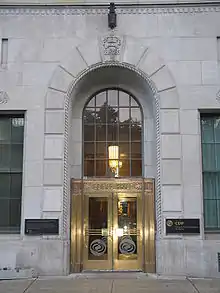 The city, eager to demonstrate a progressive ethos, gave assent to the project despite heavy criticism that the administration was proving unable to protect Québec′s historic area, as the building was slated to replace two historic houses.[4] Sources conflict as to exactly when construction started: one cites June 1929 to May 1930;[3] while another states the construction permit was delivered in December 1929 and construction began in June 1930;[2] and a third gives only years: 1928–1930.[5] The building's cornerstone bears an inscription which reads "This stone was laid Oct. XXIX MCMXXIX [October 29, 1929]".[6] However, all sources agree that construction was rapid, and the building was finished within a year. It was inaugurated in 1931.[2]