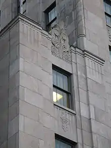 Édifice Price was constructed in the art deco style of the time, as was the neighbouring Clarendon Hotel, whose extension was completed a few years earlier.[19] The design uses setbacks to gradually taper floor area down, yielding the typical elongated "wedding cake" shape which contributes in reducing loads and softens the building's visual impact on the city's skyline. The upper setbacks were later used to build balconies.[8][9] Because the building is deeper than it is wide, it appears much bulkier when viewed from the side. This is reminiscent of Finnish Art Nouveau architect Eliel Saarinen′s work, and is the stylistic opposite of other buildings in the city such as the Château Frontenac, whose cantilever construction widens as it gets taller.[5] Geometric motifs are carved in the Price Building′s stone cladding, especially over the first few levels. The building is topped by a more classical, specifically Châteauesque, steepled copper roof.[2][19] The final composition displays Beaux-Arts influences.[2] The main exterior′s decorative themes are pilasters topped with palm motifs, pinnacles, and a large vaulted arch with extrados over the main entrance.[5][8]