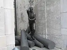 L'Homme-Rivière is a statue representing a log driver at work. The logs are heavily stylized, reduced to little more than cylinders. The driver and his hook, however, are shown as transforming into a wooden plant. Its location, in a tight space between two tall buildings, gives the sculpture the appearance of travelling down a river gorge. L'Homme-Rivière is highly dynamic, and has been described as looking as though it is about to spill onto the sidewalk. The log driver is a symbolic figure in the history and culture of Quebec, thanks notably to Félix-Antoine Savard's famous novel Menaud, maître draveur.[23]