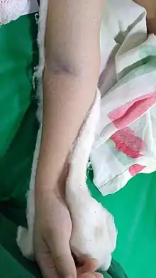 - "Kirmisson's sign": Transverse striated ecchymoses at the elbow seen in fractures of the humerus with displacement of the higher fragment.