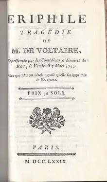 Ériphyle is a tragedy in five acts by Voltaire. He began working on it in 1731 and it was completed and performed in 1732. The poor success of the stage premiere prompted Voltaire to cancel the printed version.