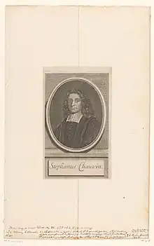 Étienne Chauvin (18 April 1640 – 6 April 1725),[1] French Protestant divine, was born in Nîmes. At the revocation of the Edict of Nantes he retired to Rotterdam where he was for some years preacher at the Walloon church. In 1695 the elector of Brandenburg appointed him pastor and professor of philosophy, and later inspector of the French college at Berlin, where he enjoyed considerable reputation as a representative of Cartesianism and as a student of physics.[2]