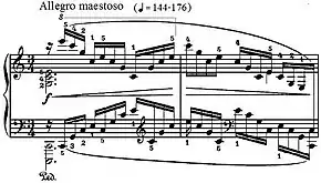 The main technical difficulty of this piece is playing the uninterrupted right hand arpeggios, including the swift position changes, in legato powerfully and accurately at the suggested tempo (quarter note = 176) without straining the hand. The momentum of the motion has to be transferred by the outer hand and the fifth finger to the accentuated top notes. French pianist Alfred Cortot (1877–1962) states that the first difficulty to overcome is "stretch and firmness in shifting the hand over nearly the whole length of the keyboard."[13] Exercises introduced by Cortot, Gottfried Galston[14] and Alfredo Casella[15] deal mostly with stretch and anticipation of position changes. Ferruccio Busoni in his Klavierübung introduces an exercise for two hands in contrary motion, somewhat reminiscent of Leopold Godowsky.[16] Australian pianist Alan Kogosowski warns against straining the right hand by constant overstretching. To avoid strain, the first note of the position "must be released like a hot potato," and the hand "should move quickly and laterally, without stretching, from the first note to the next note and the next position."[17]