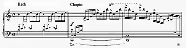 Its harmonies resemble a chorale and its relationship to Bach's Prelude No. 1 in C major (BWV 846) from The Well-Tempered Clavier has been noted by musicologist Hugo Leichtentritt (1874–1951), among others.[6] A fictional example of Chopin's harmonies with Bach's figuration and vice versa is given by British musicologist Jim Samson (born 1946).[7] A harmonic reduction ("ground melody") of the work can already be found in Carl Czerny's School of Practical Composition.[8]