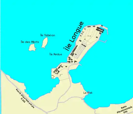 In 1720, the neighbouring island of Trébéron became a quarantine island or lazaret for lepers, with Île des Morts as its cemetery. During the 18th century, the arsenal at Brest was supplied with gunpowder from the powder-mills of Pont-de-Buis. Transported by boat, the gunpowder made a last stop at the île d'Arun, at the mouth of the River Aulne. However, the magazine on the île d'Arun was small and remote from Brest and was not convenient in the context of the Napoleonic Wars, with the British fleet blockading Brest. In 1808, Jean-Nicolas Trouille, director of the maritime works at Brest, decided to develop Île de Morts by adding powder magazines.[1] The rock-breaking works done by convicts from the Brest prison allowed him to level a plateau on which to build three 45m-long and 12m wide two-level powder-magazines (in which the use of metal was banned to avoid risk of explosion). In completing the magazines, he also built a mole out towards île Trébéron, several landing points and a barracks for the magazines' garrison.