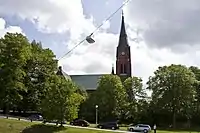Örgryte new church (Swedish: Örgryte nya kyrka) is a church in the gothic style on Svalberget. The church is a part of the Örgryte congregation (Swedish: Örgryte församling) in Gothenburg. Because of the nature of the plot, the church is oriented northeast–southwest. It has a cross layout with open rafters and vaulted, pentagonal chancels. The church tower is almost 60 meters tall.