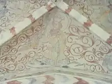 The murals in the chancel are from the middle of the 15th century and unusually well-preserved with vivid colours and sharp contours. They depict the four saints Barbara, Gertrude, Olaf and Canute. The baptismal font of the church is from the late 12th century and originally perhaps belonged to another medieval church, Västra Vrams kyrka, which was demolished in the 19th century and replaced with a new building. The font has carved floral ornamentation, and has on stylistic grounds been attributed to the Romanesque artist Tove. The other furnishings are considerably younger; the pews are partially from 1611 but mostly from the 19th century, and the richly decorated wooden pulpit is from 1636.[1][2]