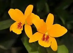 • Laeliocattleya (syn. Cattleya) Dorset Gold – Has flowers with yellow petals edged with crimson. The lip is ruffled and is red-purple, with gold streaks along the throat.[3]