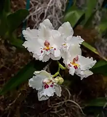 × Burrageara, abbreviated Burr. in the horticultural trade, is the nothogenus for hybrids between the orchid genera Cochlioda, Miltonia, Odontoglossum and Oncidium.[8] It was grown for the first time by the American Albert Burrage in 1927, and named after him. When Cochlioda and Odontoglossum are synonymized with Oncidium, the parents of × Burrageara become just Miltonia and Oncidium. For example, the grex name × Burrageara Helen Kelley is a synonym of × Miltonidium Helen Kelley.[9] Its parents include Oncidium hastatum and Oncidium noezlianum,[10] previously placed in Odontoglossum and Cochlioda respectively.[11][12]