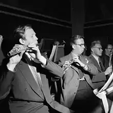 ![]() Ørnulf Gulbransen at left, at a practice with in Universitetets Aula, 1953. | |