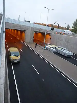 The Ülemiste Tunnel is a road tunnel in Tallinn, Estonia.[1] It is located southeast of the city centre near the Lake Ülemiste. The tunnel connects Peterburi Road (Tallinn–Narva Road, part of E20) with Järvevana Road (part of the inner beltway). It opened on 9 October 2013. The tunnel is 320 m (1,050 ft) long and consists of two parts divided by a thick concrete wall. It is the only road tunnel of its kind in Estonia.