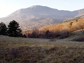 Čaven is a ridge above the Vipava Valley in southwestern Slovenia. It constitutes the southern rim of the Trnovo Forest Plateau in the northern Dinaric Alps. Its highest peak is Big Modrasovec (Veliki Modrasovec) (1353 m a.s.l.), its slightly lower peak is Little Modrasovec (Mali Modrasovec) (1305 m a.s.l.), and the most scenic peak is Kucelj (1237 m a.s.l.). The peak Čaven in the west of the ridge has an altitude of 1185 m. Čaven may be ascended by trail from Predmeja, Stomaž, and Lokavec. From Čaven, one may view the Vipava Valley and the landscape to the Adriatic Sea. Two other nearby peaks are Sekulak (888 m a.s.l.) and Big Edge (Veliki Rob) (1237 m a.s.l.). Between Veliki Modrasovec and Mala Gora 1034 m a.s.l.), there is Anton Bavčer Lodge at Čaven.[1] Čaven is built of upper Jurassic limestone. Next to the road on Selovec (1265 m a.s.l.), there is a prominent reef limestone site with fossils of coral colonies and hydrozoans.[2][3] Čaven is the growing site of various brooms (Genista) and of the endemic herbaceous perennial Hladnikia pastinacifolia.[4][5]