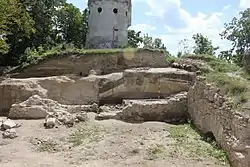 Ruins of medieval Čeklís Castle. Early 20th century water tower in the background