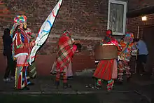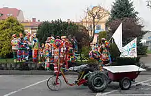 Śmiergust participants continue dousing people with water on Easter Monday. They gather on the market square and when the women leave the church, they are caught and doused with water.[5] The characters also stage impromptu shows and play tricks on their hosts (such as carrying a cart onto a barn's roof).[5][6] The arrival of Śmiergust men is announced by the noise of dragged cans, whistles, trumpets and the ensuing singing and music.[5][6] The noise and music perform a symbolic function – to awaken "the sleeping life of nature".[3]