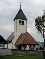 The local church is dedicated to Saint Paul and belongs to the Parish of Sostro. It is a single-nave church with an apse with late Gothic painting. Its architecture attests to a medieval origin. It has a bell-gable, a wooden portico, and a walled cemetery. It was remodeled in the 17th century and the main altar with a painting of Saint Paul was created in 1878 by Štefan Šubic[13] (1820–1884).[14] The chancel was rebuilt and painted in 1668. The walls are decorated with remnants of images of the twelve apostles, and winged symbols representing the four evangelists decorate the vault.[15] A side altar dedicated to Saint Wolfgang dates from the end of the 17th century.[5]