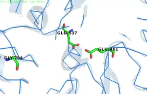 - ↑ Yuan J, Martinez-Bilbao M, Huber RE (April 1994). "Substitutions for Glu-537 of β-galactosidase from Escherichia coli cause large decreases in catalytic activity". The Biochemical Journal. 299 (Pt 2): 527–31. doi:10.1042/bj2990527. PMC 1138303. PMID 7909660.