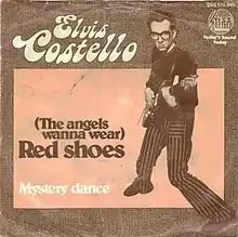 "(The Angels Wanna Wear My) Red Shoes" was recorded a few months after it was written to appear on Costello's 1977 debut album, My Aim Is True.[2] The song was later released as the third single from the album in July 1977. The B-side of the single was "Mystery Dance", another song from My Aim Is True. Preceding singles "Less Than Zero" and "Alison" were unsuccessful, but the popularity of My Aim Is True gave Costello hope for the single; Costello recalled, "'(The Angels Wanna Wear My) Red Shoes' was my third Stiff Records single to be released. The first two ... had sunk without a trace, but after initially scant sales, all the publicity around the release of My Aim Is True had actually threatened to push 'Red Shoes' into the singles charts".[6] Despite the greater visibility, the single failed to chart.[7]