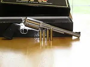 The largest commercially produced revolver: Smith & Wesson Performance Center Model 500 built on the company's X-Frame. This one has a 7.5 inch barrel. Bullet weights for commonly available ammunition vary from 275 to 500 grains; heavier custom cast bullets up to 700 grains for reloading are available.