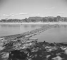 While XXXIII Corps bridged the Chindwin at Kalewa, 101st HAA Rgt provided AA protection for the bridgehead. Although Japanese air attacks had been slight, now they made determined efforts to destroy the 1,150 feet (350 m) Bailey bridge, but the HAA and LAA guns fired intense concentrations that broke up the attacks and shot down several aircraft; the bridge remained intact.[36][40]