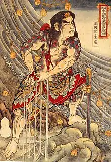 | 4 | 4 | Tianxian (天閒); Leisure Star (天閒星) | Gongsun Sheng (公孙胜; 公孫勝; Gōngsūn Shèng; Kung-sun Sheng) | "Dragon in the Clouds" (入雲龍) | Strategist | Strategist in charge of army formation | Taoist | Jizhou (present-day Ji County, Tianjin) | 14 | Sword, Taoist magic | ![]() | Left before the Fang La campaign | ||