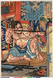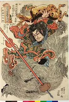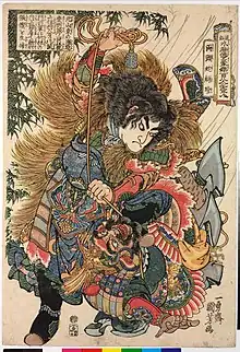 | 14 | 14 | Tianshang (天傷); Harm Star (天傷星) | Wu Song (武松; Wǔ Sōng; Wu Sung) | "Pilgrim" (行者); "Tiger-fighting Hero" (打虎英雄) | Chief Wu (武都頭); Grandmaster Qingzhong (清忠祖師) "Wu the Second" (武二郎) | Infantry | Infantry leader | Constable | Qinghe County, Xingtai, Hebei | 23 | Pair of sabres, staff | ![]() | Survives | |
