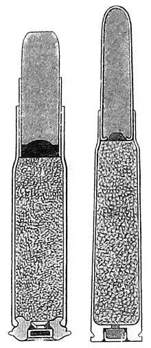 A two-piece 11mm cartridge (left) compared to a more modern 7.65×53mm Mauser