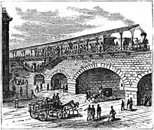 This station was rebuilt in 1896–1897 as the line's grade was raised onto iron girders. The viaduct and new station opened in February 1897.[5]