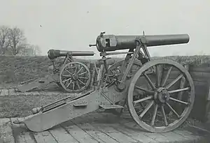 In early 1870 the Dutch field artillery was very backward. In March 1871 the Minister for Defense therefore sent two artillery officers to Switzerland to study a new bronze breech loading field gun of 84 mm caliber. These officers bought a gun (the 8.4 cm Feldgeschütz Ord 1871) and 500 shot in Winterthur.[4] In early 1872 the gun arrived and was successfully tested against the Dutch 8 cm rifled muzzle loader.[5] Judging by its appearance the 12 cm A No. 2 gun seems to have been modeled on the 8.4 cm gun.