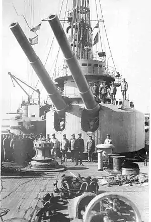 The seventeen battleships employing these guns had turrets of six distinct types. The earliest turrets of Tri Sviatitelia, Sissoi Veliky, Pobeda and Petropavlovsk were powered with hydraulic machinery and their firing rate was on par with the 12-inch 35 caliber guns mounted in electrified turrets.[4] Retvizan became the first battleship with 12-inch 40 caliber guns in electrified turrets.[6] Designers of the Borodino-class battleships increased firing rate to 90 seconds from shot to shot.[6] The range of all these guns was limited by their modest vertical firing angle of 15°.[6] Potemkin, designed to fight the Turkish defenses in The Straits, had its firing angle increased to 35° but required four minutes from shot to shot.[6] The two Andrei Pervozvanny-class battleships, built in 1904–1911, were the last ships to receive the 12-inch 40 caliber guns (in 1907 the Navy adopted the long-range 12-inch 52 caliber guns designed for the Gangut-class dreadnoughts).[6] The turrets of Andrei Pervozvanny allowed firing two broadsides per minute and allowed firing angles of up to 35°.[6] The Navy planned to install similar turrets on the obsolete Chesma but the conversion was canceled.[6]