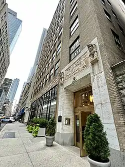 The extreme ends of the base, flanking Beit Simchat Torah's space, contain entrances recessed within travertine marble doorways. The western (right) entrance is used by tenants and their guests, while the eastern (left) entrance is a loading dock.[10] Both entrances are surmounted by tan and brown terracotta panels, which are mirror images of each other. Each panel depicts two hunters in a horse-drawn chariot (one of whom is pointing a bow and arrow at an antelope) as well as a smaller animal under the horse.[15][9] The two-toned panels helped passersby and visitors to identify the entrances easily.[9] Sculptures of lions protrude from the building on either side of each panel.[15][9] Above each entrance, placed within the lintel of the doorway, is a bronze insignia. It consists of the acronym "SJM" surrounded by a wreath, under which is the word "Building".[16]