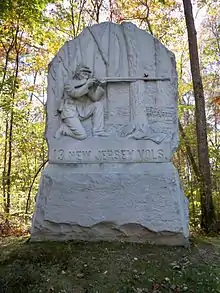 Three small monuments were erected in the Antietam National Battlefield to mark the positions the 13th New Jersey held during the battle. A large monument to the unit was erected on Carman Avenue, McAllister Woods in the Gettysburg National Military Park.