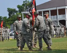 ![]() MAJ Steven M. Finney (left of center) accepts the battalion colors from the Louisiana Adjutant General, MG Bennett C. Landreneau (right of center) becoming the battalion commander in June 2011