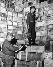 Pusan, South Korea, December, 1957: The picture to the right shows Master Sgt. Robert S. Boyd, left, and Pvt. Allen G. Ladwig check a mountain of boxes containing stored meals at the 142nd Quartermaster Battalion's Plant No. 1. The giant supply operation was responsible for, among other things, receiving, storing and issuing all perishable foods arriving at Pusan port from the U.S., Japan and Okinawa. The 142 used 100 tons of ice and 1.5 million pounds of salt to keep everything fresh during the summer; a bakery unit attached to the battalion baked about 45,000 one-pound loaves of bread per month for troops in the Pusan Area Command.[11]