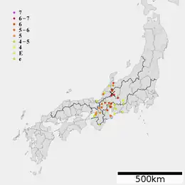 The Tenshō earthquake (Japanese: 天正地震, Hepburn: Tenshō Jishin) occurred in Japan on January 18, 1586 at 23:00 local time. This earthquake had an estimated seismic magnitude (MJMA) of 7.9,[2] and an epicenter in Honshu's Chūbu region. It caused an estimated 8,000 fatalities and damaged 10,000 houses across the prefectures of Toyama, Hyōgo, Kyōto, Osaka, Nara, Mie, Aichi, Gifu, Fukui, Ishikawa and Shizuoka.[3] Historical documentation of this earthquake was limited because it occurred during the Sengoku period.