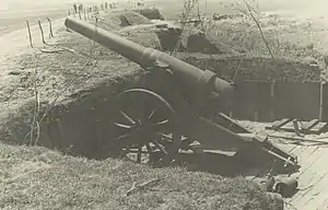 During the mobilization for World War II the 15 cm Lang staal L/24 was brought out of storage. Three new artillery regiments of only one company (Artillerie Afdeling) were founded. These were the units: 24 AA, 25 AA and 26 AA. Each had three batteries of 4 15 cm Lang staal L/24, but no traction.[26] 25 AA was actively engaged in the fight near Moerdijk. Four of its 12 guns permanently broke down due to mechanical defects. For multiple reasons, the fire of the guns was almost completely ineffective. 26 AA was in Numansdorp. When the enemy did not appear before its guns, it had to move. After the orders were given, and horses were collected etc. two days had passed, and the army had surrendered.[27]
