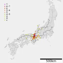 The 1662 Kanbun earthquake (Japanese: 寛文地震) affected Japan on June 16, 1662. The magnitude was M7.6.[2] Strong shaking were felt over a wide area, mainly in the Northern Kinki region (Around Lake Biwa), and damage was particularly severe in Ōmi and Wakasa.[3][4] There was also great damage in Kyoto.[5] The earthquake killed 700–900 people and destroyed 4000–4800 houses.[6][7] This earthquake caused crustal deformation; east of Lake Suigetsu land rose 4.5 m (15 ft)).[8]