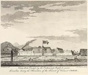 Once the Endeavour arrived on the island, Cook decided to set up the Venus transit observatory on shore. He required a completely stable platform which the ship could not provide and plenty of space to work with. The location of the observatory would be known as "Fort Venus." A sandy spit on the northeast end of Matavai Bay, named Point Venus by Cook, was chosen for the site.[13] They began building Fort Venus two days after they arrived. They marked a perimeter and construction began. It had earthworks on three of its sides adjacent to deep channels. Wood was gathered to construct palisades that topped the earthworks. Casks from the ship were filled with wet sand and used for stability. The east side of the fort faced the river. Mounted guns were brought in from the ship. A gateway was assembled and within this fortification, fifty-four tents were pitched which housed the crew, scientists, and officers as well as the observatory, blacksmith equipment and a kitchen.[14] Cook sent a party led by Zachary Hickes to a point on the east coast of the island for additional observations. John Gore led another group of thirty-eight more on a neighboring island of Eimeo (Mo’orea). Both parties were briefed and supplied with the needed equipment.[11]