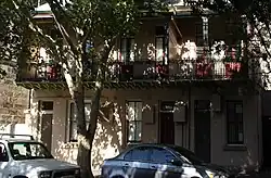 A two-storey Victorian Filigree terrace house with three bedrooms. Features include painted stuccoed masonry, a cantilevered balcony over footpath, cast iron balustrade and verandah supports, a corrugated iron verandah, two french doors with fanlights on upper storey, fanlight over front door and a sash window with slab sill on ground floor.[1]