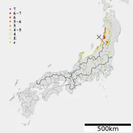 A total of 150 fatalities resulted.[6] According to various sources, between 360 and 600 homes were washed away by the tsunami or destroyed in the shaking. Another 1,790 homes sustained partial destruction. In the Shonai region, 158 houses and 322 boats and ships were lost. An estimated 38 residents died in the tsunami. At Sado, 123 homes were destroyed.[10] An additional 47 people died in Wajima,[11] on the Noto Peninsula. A maximum JMA seismic intensity 6 was estimated in an area measuring 80 km (50 mi) in length from Niigata to Yamagata prefectures.[12] Seismic intensity 5 extended 250 km (160 mi) from Niigata to Akita to the Yamagata basin along the Mogami River. Shaking resulted in the partial destruction of Tsuruoka, Oyama, Makisone, Yosida, Okushinden, and Hironoshinden. Generally, damage in the region in proportion to the number of buildings was not great. The greatest damage was reported along the coast. Liquefaction was observed at Matsugasaki, Sado.[13]