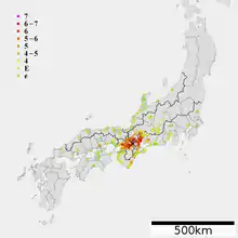 The 1854 Iga–Ueno earthquake (Japanese: 伊賀上野地震) occurred on July 9, 1854, and struck the Kansai region of central Japan.[2][3] According to the official confirmed report, 2,576 houses and buildings were damaged, with 995 human fatalities and 994 injures in the affected area.