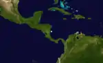 Based on reports of a strong gale, a tropical storm was first tracked about 250 miles (400 km) east-southeast of Barbados early on August 24.[1] It initially headed westward, before re-curving west-northwestward early on the following day. Shortly thereafter, the storm passed through the Windward Islands between Grenada and Saint Vincent and the Grenadines. The storm peaked with winds of 70 mph (115 km/h) while moving northwestward across the Caribbean Sea. It weakened slightly before making landfall near San Pedro de Macorís, Dominican Republic with winds of 60 mph (95 km/h) early on August 27. The storm slowly weakened over Hispaniola and was last noted near Bombardopolis, Haiti later that day.[2]
