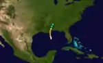 The ship Orphan encountered a hurricane with winds of 80 mph (130 km/h) in the central Gulf of Mexico on September 15.[4] It strengthened quickly while moving northward, becoming a Category 2 hurricane later that day. By 0000 UTC on September 16, the storm peaked as a Category 3 hurricane with maximum sustained winds of 125 mph (200 km/h), making it the strongest tropical cyclone of the season. Shortly thereafter, the hurricane made landfall near Buras-Triumph, Louisiana at the same intensity. It weakened after moving inland, decreasing to Category 1 intensity later on September 16. Early on the following day, the system weakened to a tropical storm, several hours before dissipating over central Alabama.[2]